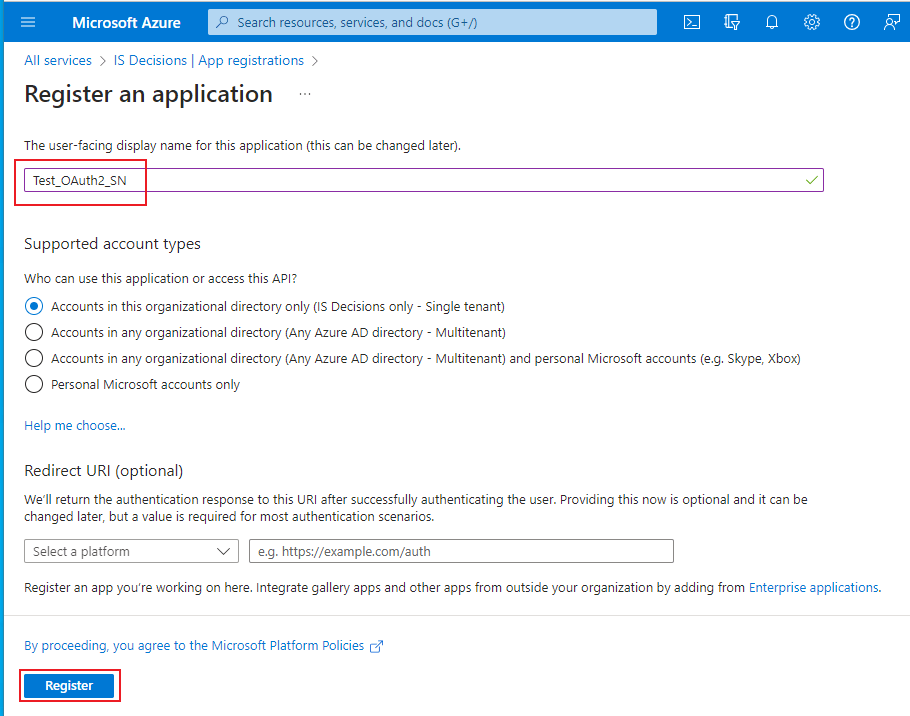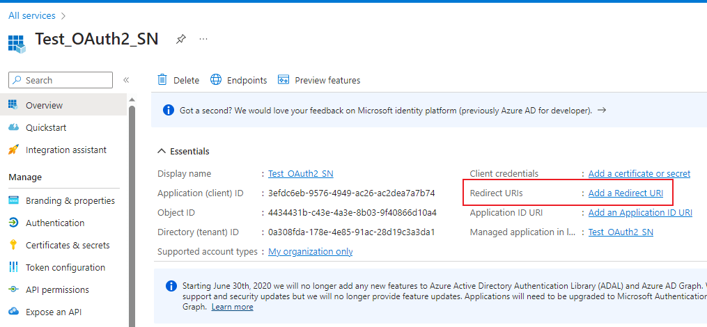 - Remplissez les champs à votre convenance et sélectionnez Enregistrer. Note: Après avoir enregistré votre application, vous avez maintenant accès au Client ID et au Tenant ID de votre application que vous pouvez copier (et retrouver en sélectionnant votre application enregistrée sous vos enregistrements d'applications dans Azure AD).