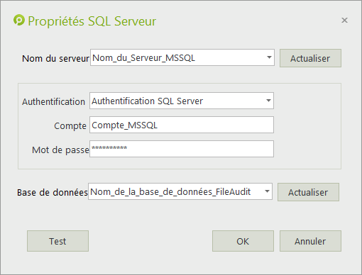 Prenez note que le mode d'authentification Windows utilisera le compte défini sur le service FileAudit (par défaut ce compte est 'Local system').