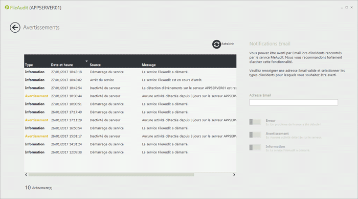 FileAudit peut vous avertir par Email lors d'incidents du service.
